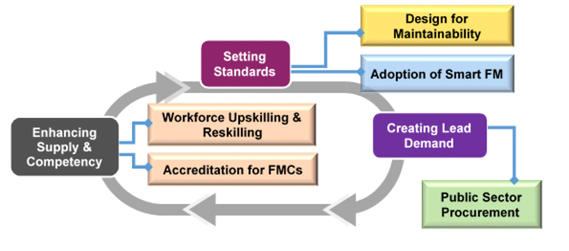 | Government sets lead demand | Government serving as an early adopter through its procurement framework to motivate the FM sector to raise competency. High quality FM services can be achieved by building capability at both firm- and personnel-level, with support from a productive, tech-leveraging workforce. |
